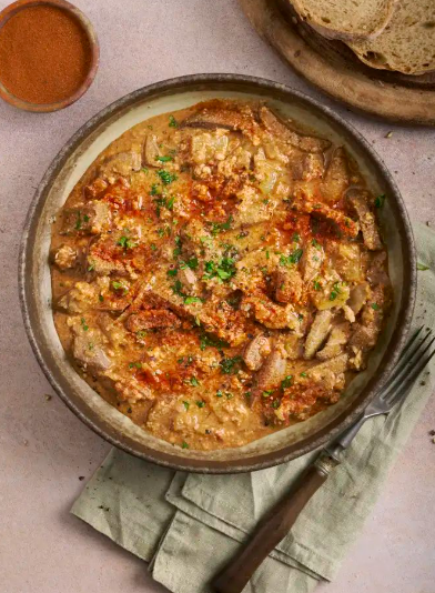Push onions to the side, add the liver slices, and sear for 2–3 minutes on each side until browned but not overcooked (it should stay soft inside). - Season & Simmer: