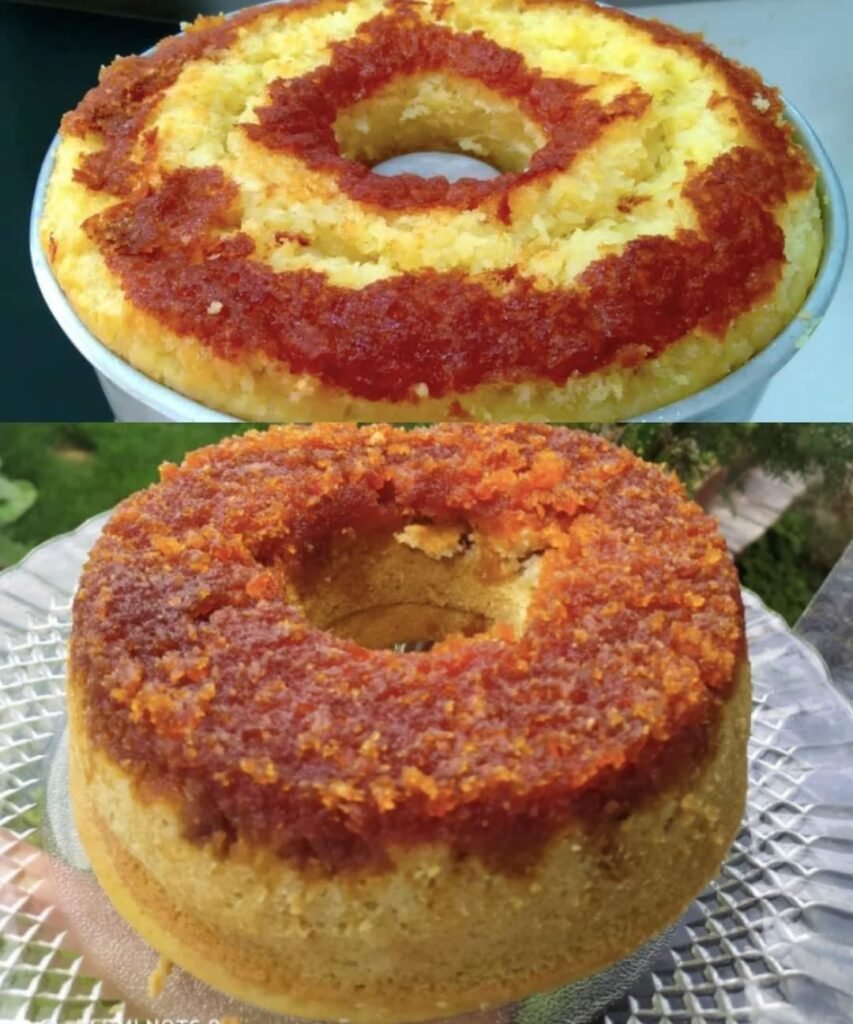 Coloque a massa na forma com a Calda de açúcar e o coco seco.
