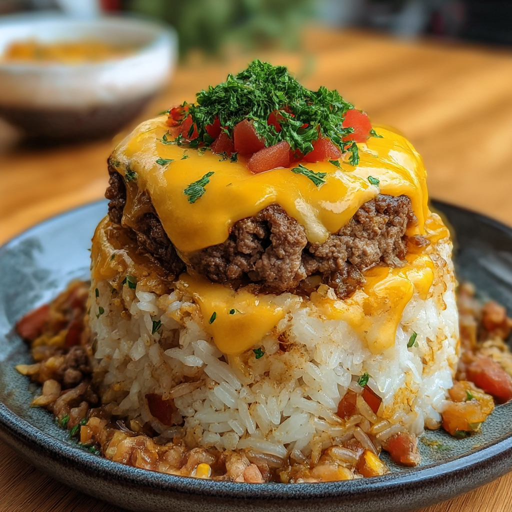 This Bacon Cheeseburger Rice Stack creates an impressive molded presentation that layers seasoned ground beef with rice and cheese, topped with additional beef instead of bacon for a heartier all-beef experience. The recipe builds cheeseburger flavors into a stacked format using a ring mold to create restaurant-style presentation. The combination