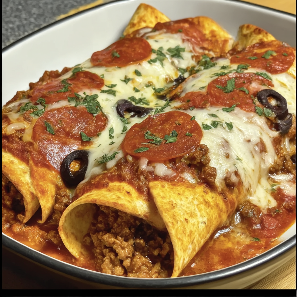 These Pizza Enchiladas combine the best elements of Italian pizza and Mexican enchiladas into one satisfying casserole that’s perfect for busy weeknights. Flour tortillas are packed with seasoned ground beef, pepperoni, vegetables, and a mixture of ricotta and mozzarella cheeses, then rolled and baked under pizza sauce with additional cheese