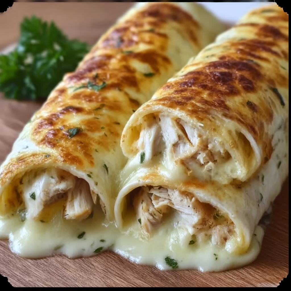 Cheesy garlic chicken wraps bring together juicy shredded chicken and a variety of cheeses, tucked into soft flour tortillas. Each wrap is coated in a fragrant blend of melted butter, minced garlic, and herbs before pan-toasting or oven-baking until golden and crispy. The result is a comforting handheld dish with melty cheese and tender meat in every bite, capped with a rich garlicky aroma.
