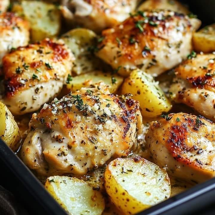 Bake in the preheated oven for 35-40 minutes, or until the chicken reaches an internal temperature of 165°F (74°C) and the potatoes are golden and tender.