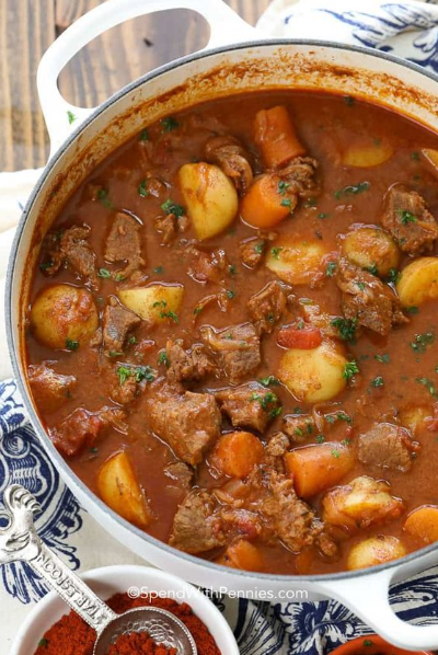 Remove pot from heat for a second, stir in paprika (this keeps it from burning and getting bitter). Add beef immediately and toss to coat.