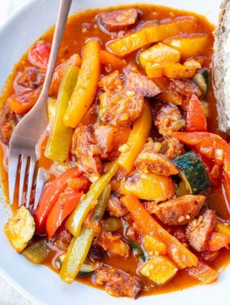 Toss in the sliced sausage and cook until browned and fragrant, about 5–7 minutes. - Add vegetables: