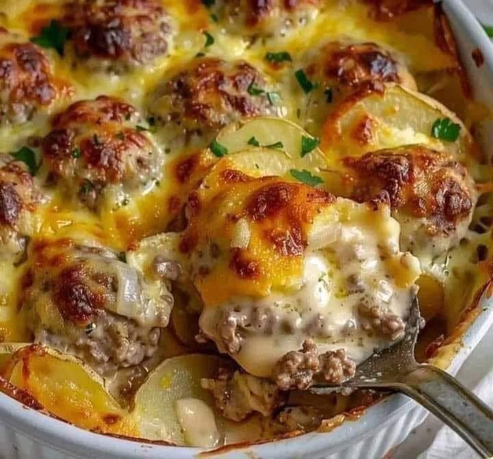 - Creamy Potatoes: The soft, creamy texture of baked potatoes soaked in cream contrasts perfectly with the meatballs.