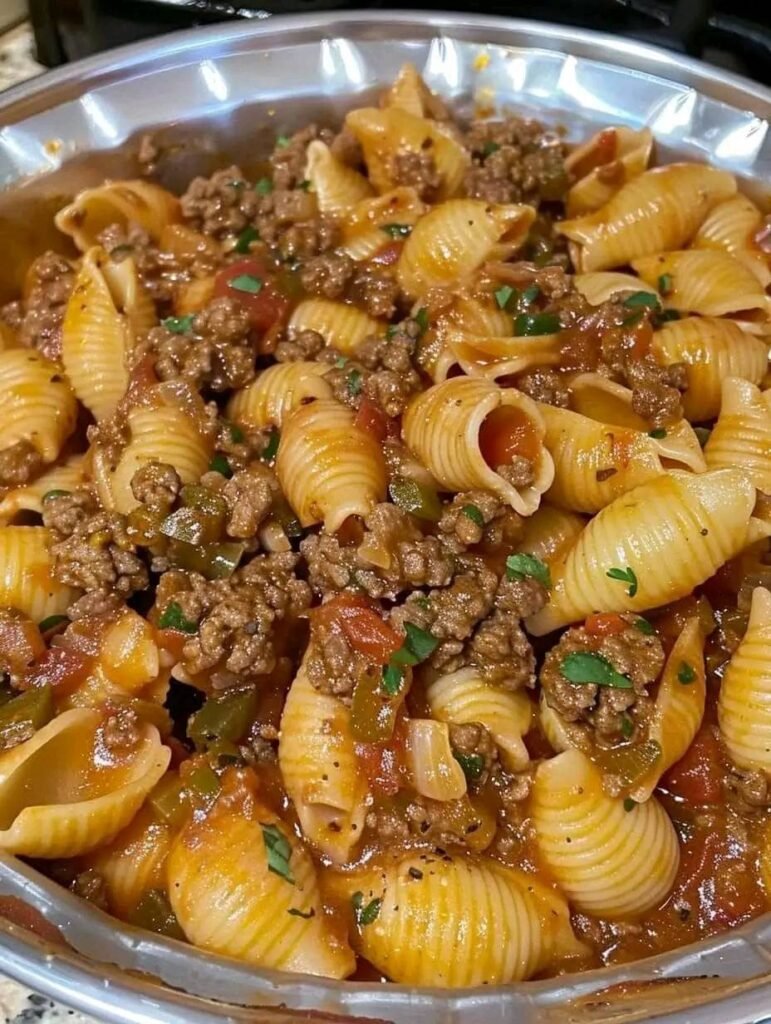 - Add the cooked pasta to the skillet with the ground beef and sauce. Stir everything together to coat the pasta in the beefy tomato mixture.